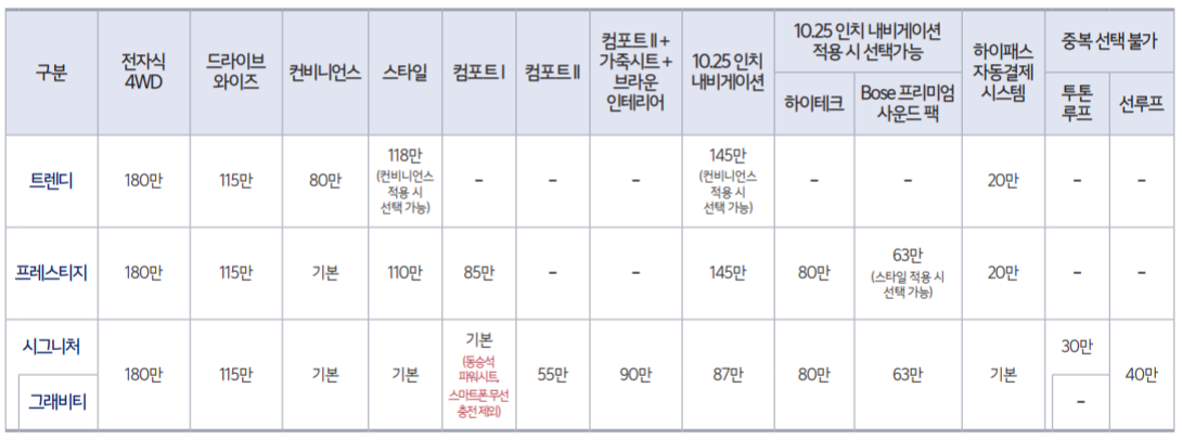 각 트림별로 넣을 수 있는 옵션은 아래 사진을 참고해주시면 됩니다.